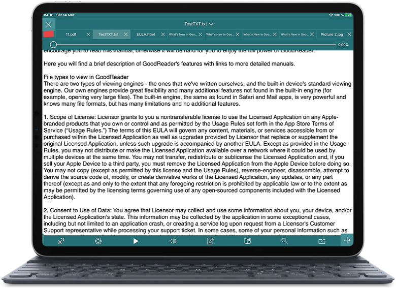 GoodReader allows you to read TXT files, including very large eBooks, with ease. Day / Night switch, Autoscroll, Read Out Loud, navigational Tap Zones, customizable Fonts & Colors are the things that make all the difference between a generic TXT viewer and GoodReader. And, of course, you can also Edit them.